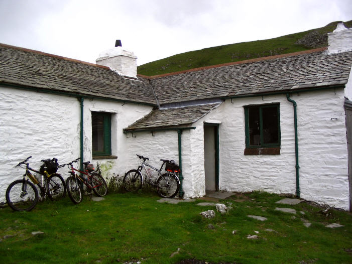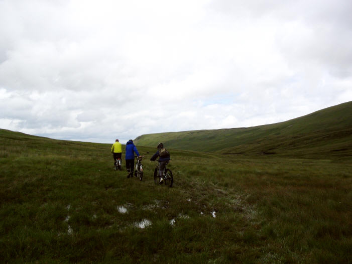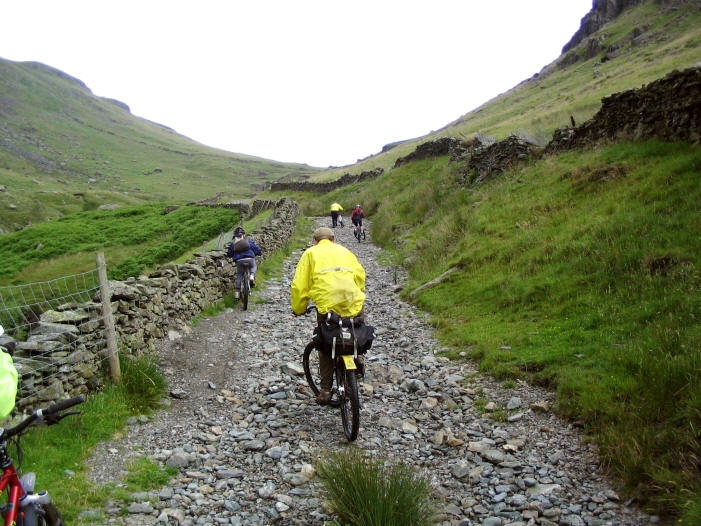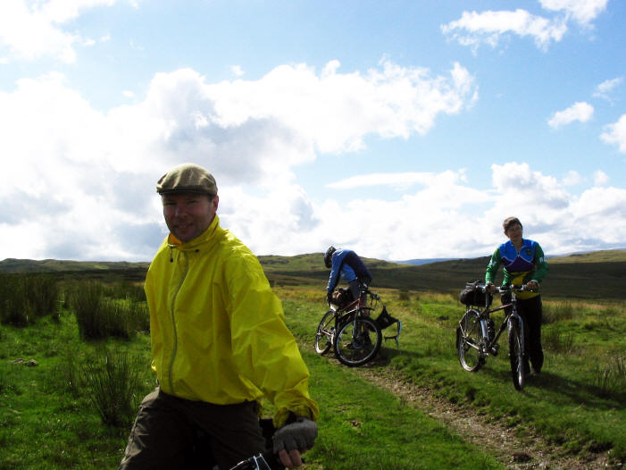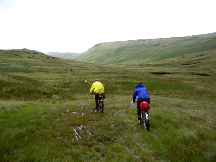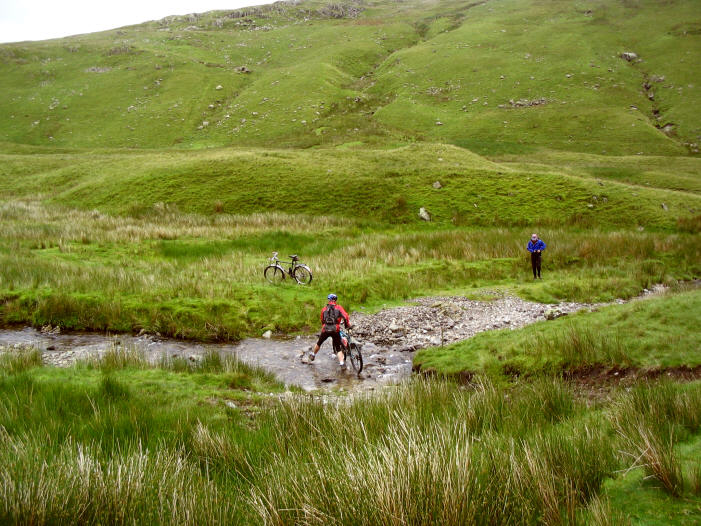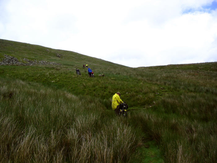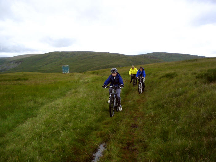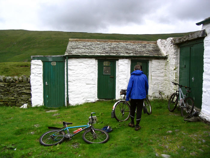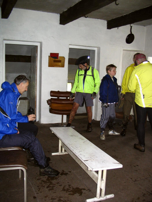 Two further members met us here.Took the usual route out past the industrial site and across Sprint Bridge and onwards to Garnet Bridge.From there straight up Longsledale to Sadgill. At Sadgill a late starter suprisingly sprinted up behind us and joined the group swelling our ranks even further. We started now on the difficult track up the dale which was very wet due the recent bad weather. The steep and slippery surface gets no easier however many times it is attempted and the large pebbles challenge both mind and body. Once the track flattens out we have lunch out of the wind at the sheepfold gates. Refreshed we head north east along the bridleway (which is very boggy in this section - no, actually, the whole area is a lake at the moment!). The decent down to Mosedale Cottage is quite fast and punctuated with a number of falls as front wheels sink axle deep into the sludge at every other stream crossing. At the Cottage we saw it was in occupation by Mountain Bothy guys and visited for a chat. Continuing on down the valley, we cross Mosedale Beck and I for one don't get any wetter than I already am by choosing to use the ford rather than the excellent bridge at this point. A tough slog up over Scam Matthew opens out to fine views across the Shap Fells and gives us a first glimpse of the Quarry Works which we will be later passing through. A much easier ride down the valley from this point and with the sun out in full force we dry out quickly.