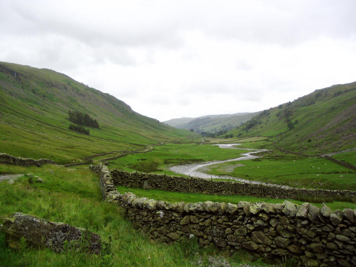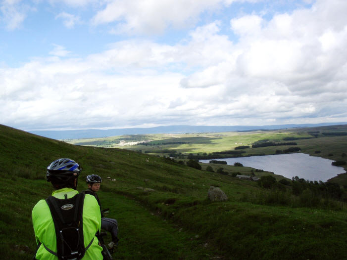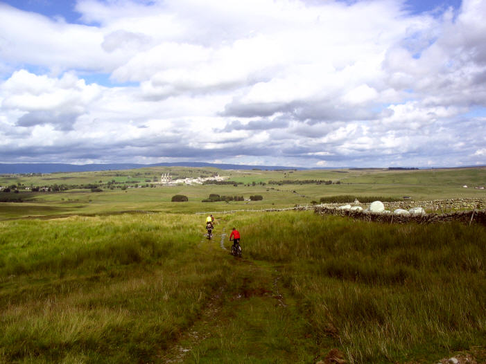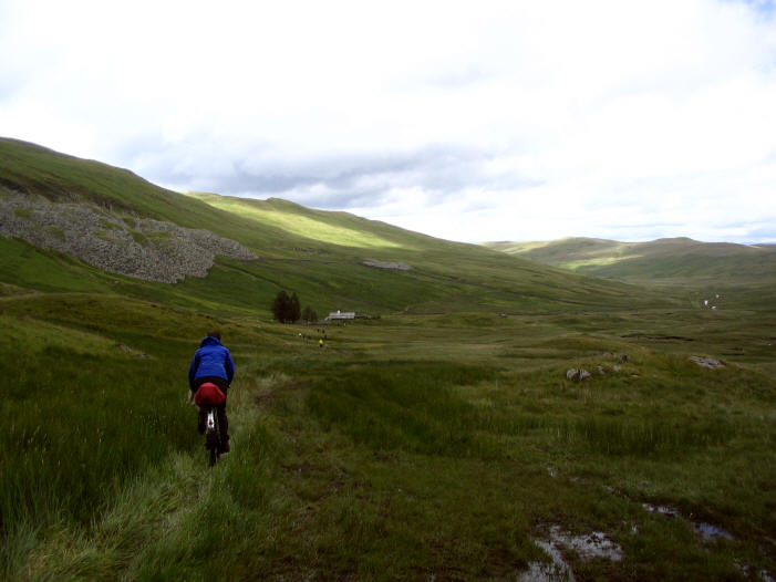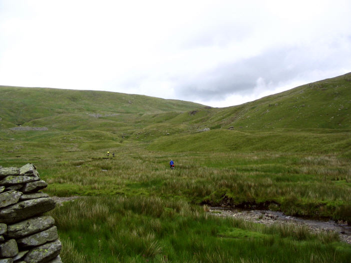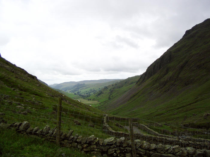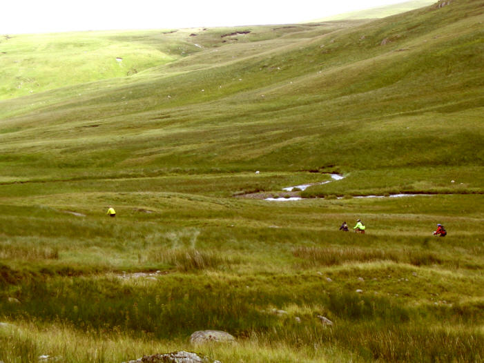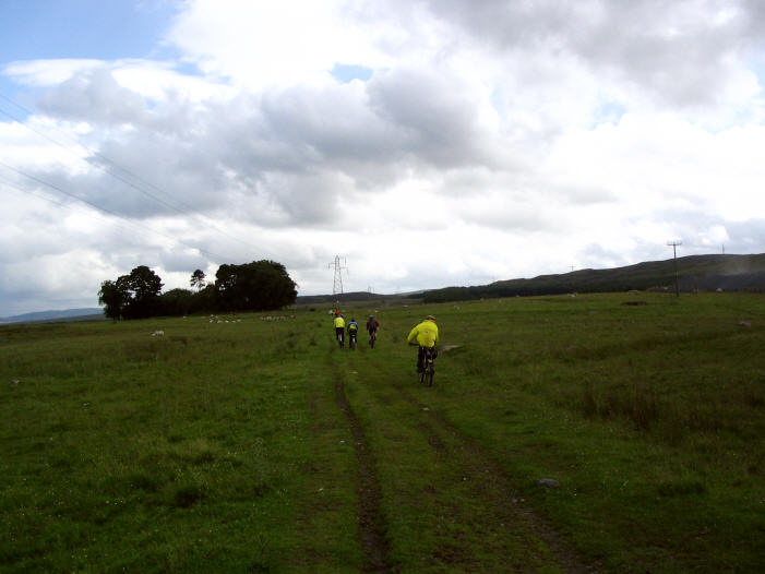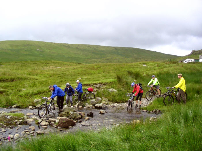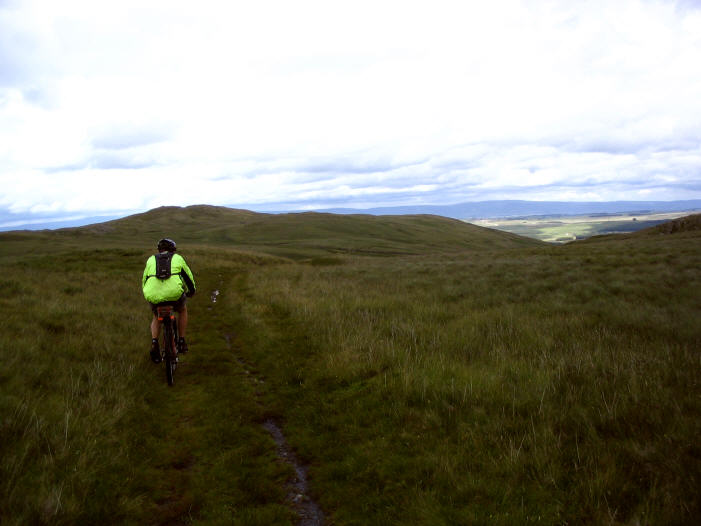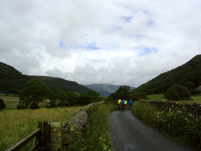 Two further members met us here.Took the usual route out past the industrial site and across Sprint Bridge and onwards to Garnet Bridge.From there straight up Longsledale to Sadgill. At Sadgill a late starter suprisingly sprinted up behind us and joined the group swelling our ranks even further. We started now on the difficult track up the dale which was very wet due the recent bad weather. The steep and slippery surface gets no easier however many times it is attempted and the large pebbles challenge both mind and body. Once the track flattens out we have lunch out of the wind at the sheepfold gates. Refreshed we head north east along the bridleway (which is very boggy in this section - no, actually, the whole area is a lake at the moment!). The decent down to Mosedale Cottage is quite fast and punctuated with a number of falls as front wheels sink axle deep into the sludge at every other stream crossing. At the Cottage we saw it was in occupation by Mountain Bothy guys and visited for a chat. Continuing on down the valley, we cross Mosedale Beck and I for one don't get any wetter than I already am by choosing to use the ford rather than the excellent bridge at this point. A tough slog up over Scam Matthew opens out to fine views across the Shap Fells and gives us a first glimpse of the Quarry Works which we will be later passing through. A much easier ride down the valley from this point and with the sun out in full force we dry out quickly.