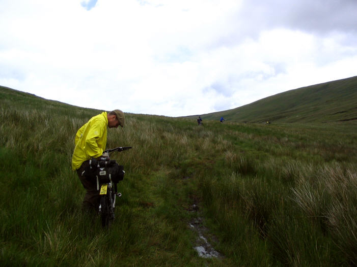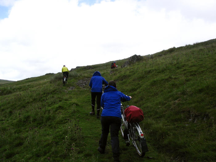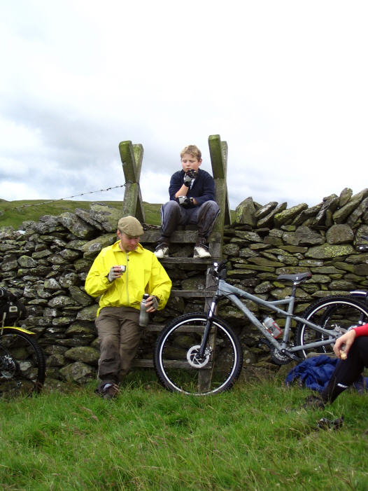 On leaving the bridleway it is a short ride by minor road to the A6 just south of Shap village. We ride south and use the bridleway through the quarry factory grounds. This track leads us back to the A6 which we join again for only a few hundred yards before picking up on the old road across Wasdale Old Bridge and over Packhorse Hill. The track is very rough having had its 'infill' washed out by the engorged streams flowing across it this year. Simeon has had a rear axle snap and chose to use the A6 route bypassing this section so we meet up back at the summit on the A6. Our younger member was not surprisingly suffering at this point so a few of us tucked together to defeat the headwind for a freewheel back to Kendal. It had been a long and difficult ride but rewarded all the effort expended.