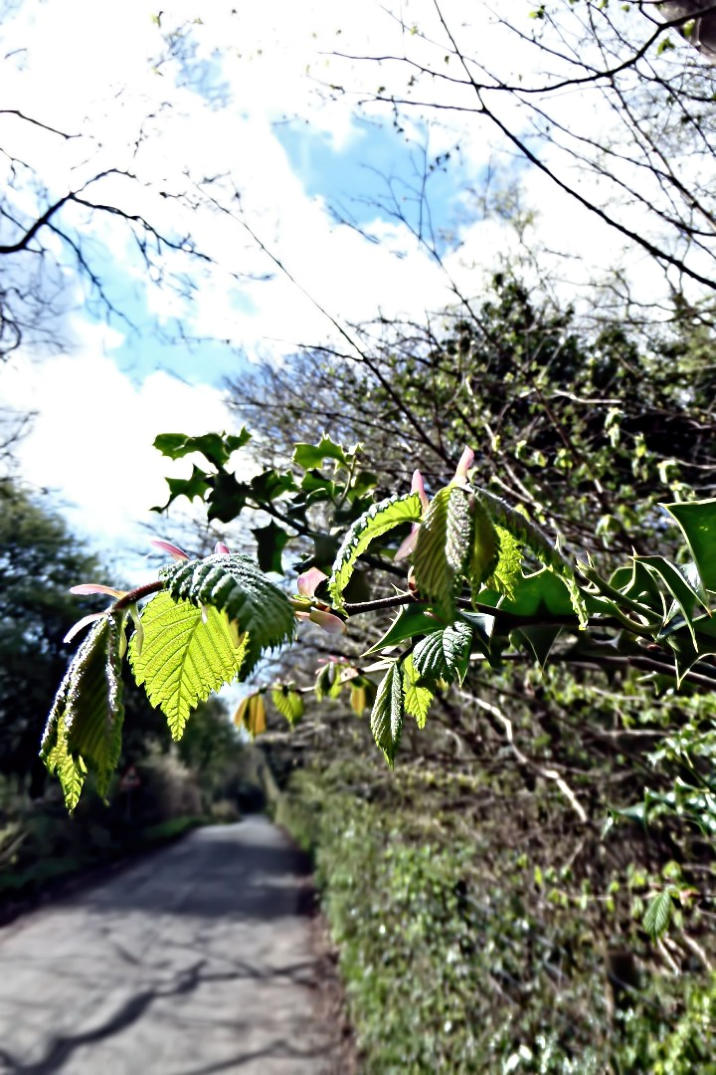 Morning sunlight on leaves on the climb up to Four lanes at Storth.