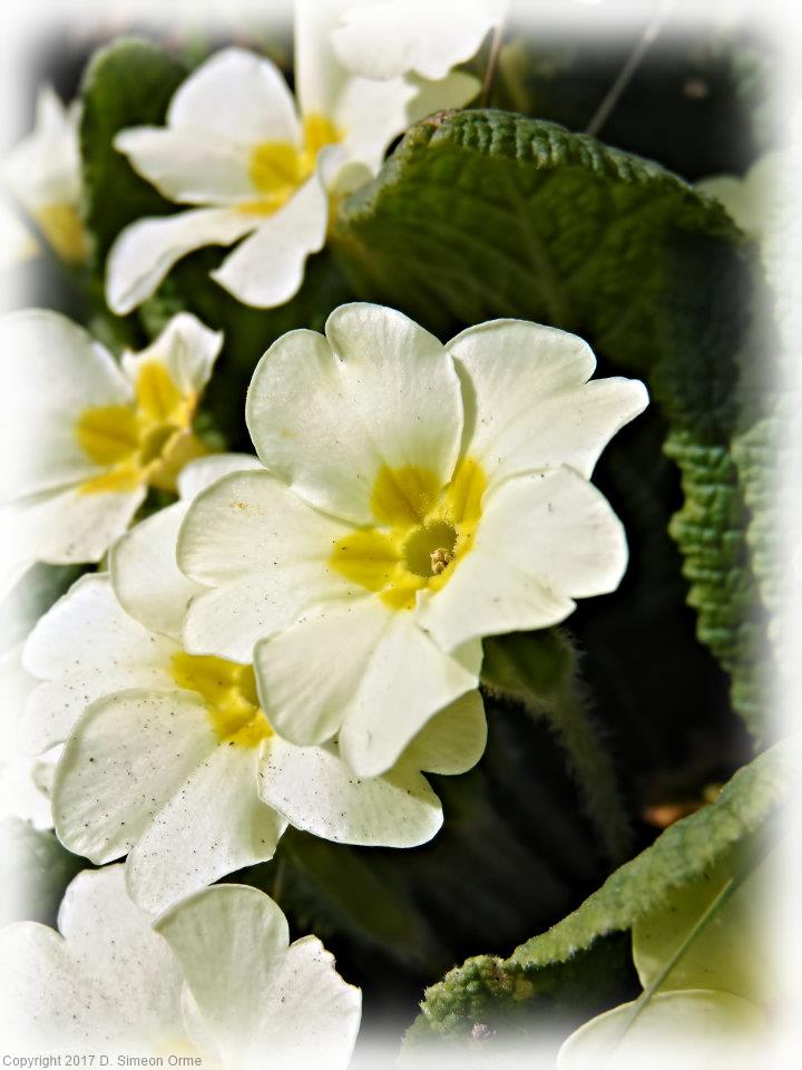 Primroses in flower at side of the lane.