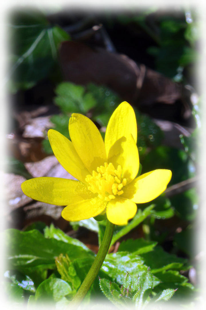 A close up of Lesser Celandine in flower at side of the towpath of Lancaster Canal.