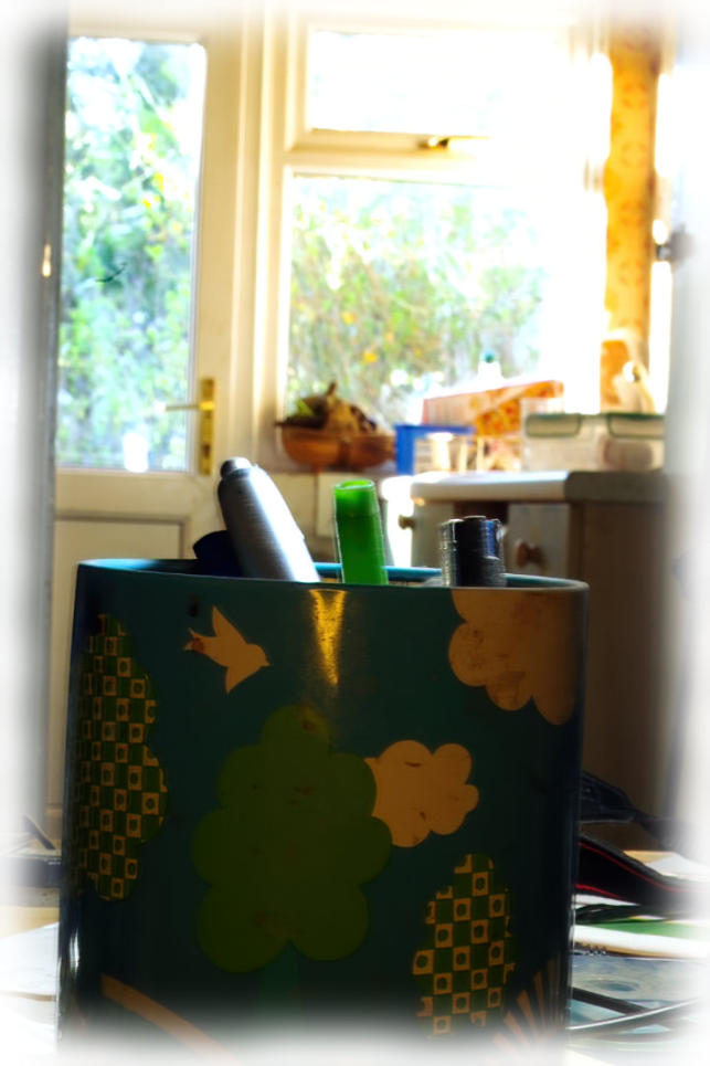 A view looking across the home office desk.