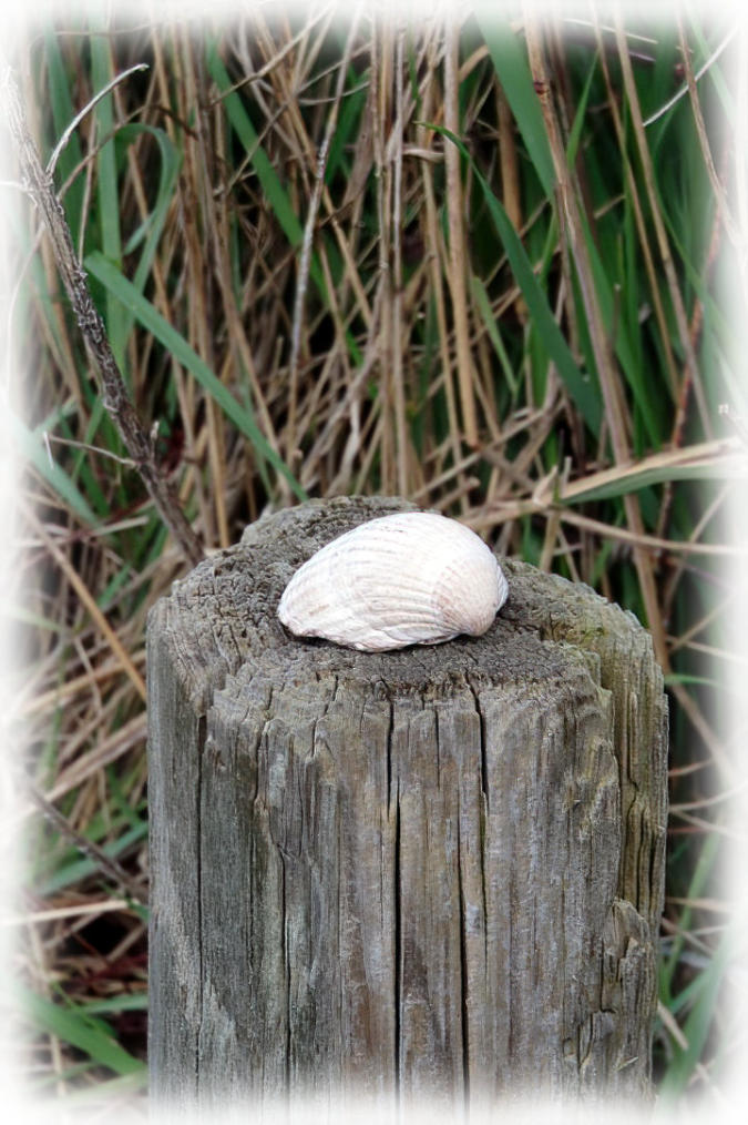 A shell on fence post at side of footpath between Bank Houses and Bank End.