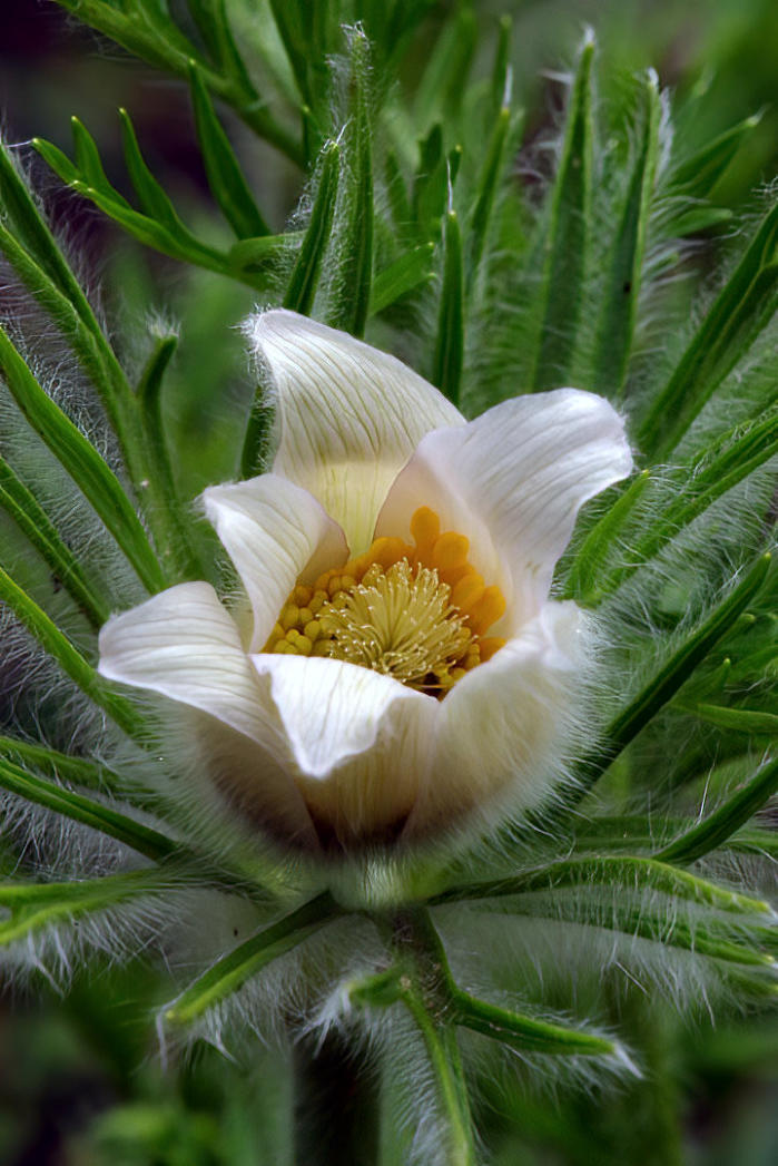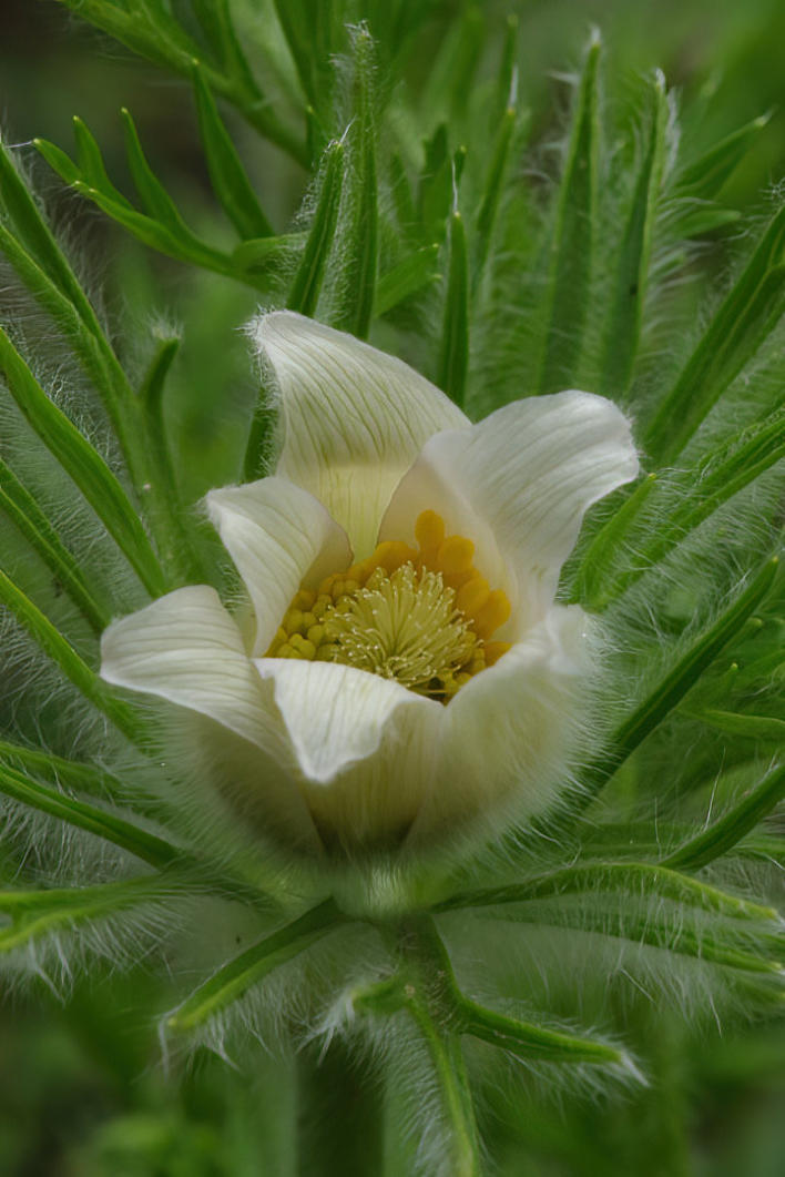 Pulsatilla vulgaris ‘Alba’ flowering in the back garden.