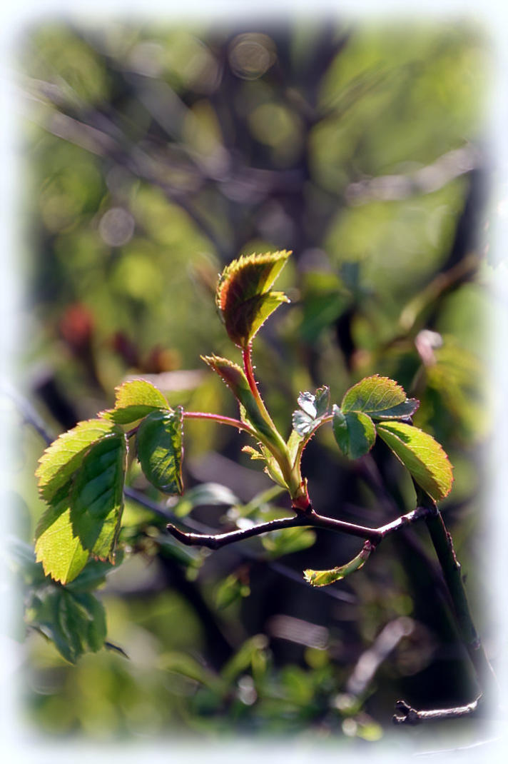 Late afternoon light shining on wild rose shoot at side of towpath of the Lancaster Canal.