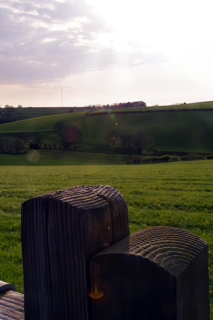 Late afternoon sunlight shining on gate at side Scargill Road near Halton.