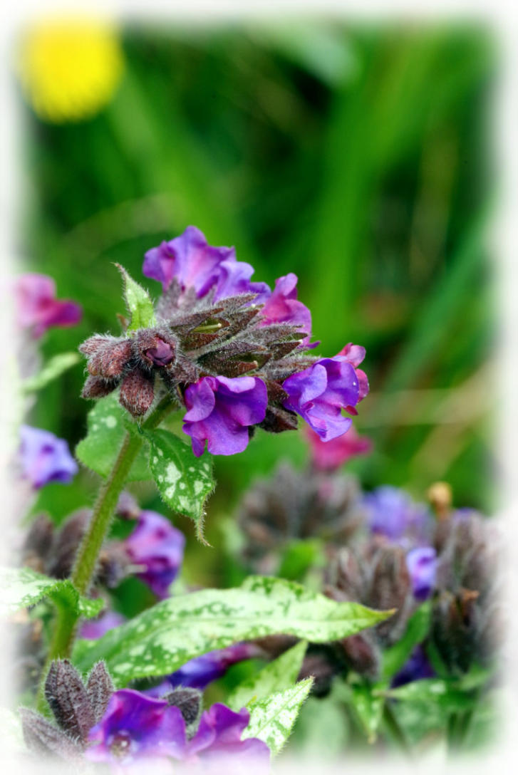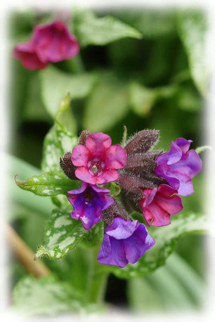 Pulmonaria ‘Diana Clare’ flowering in the back garden.