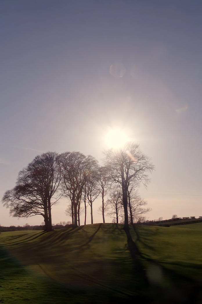 Late afternoon sunlight shining on tree in field at side of Kellet Lane