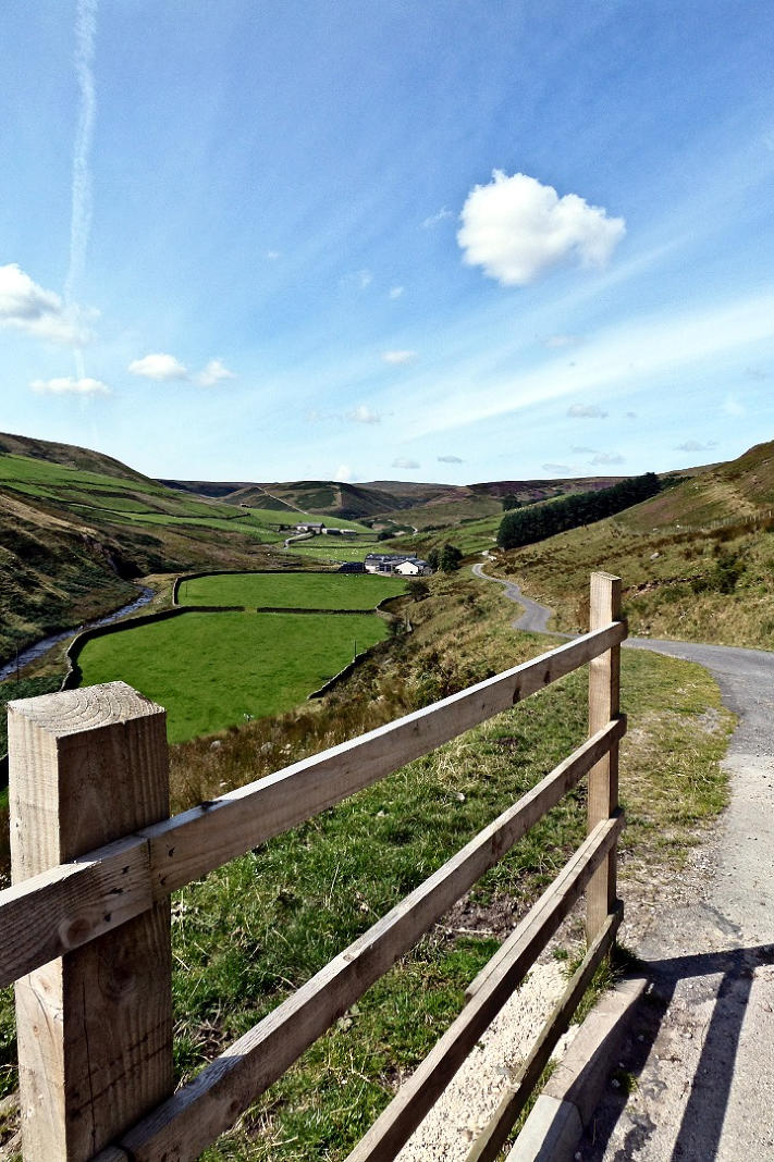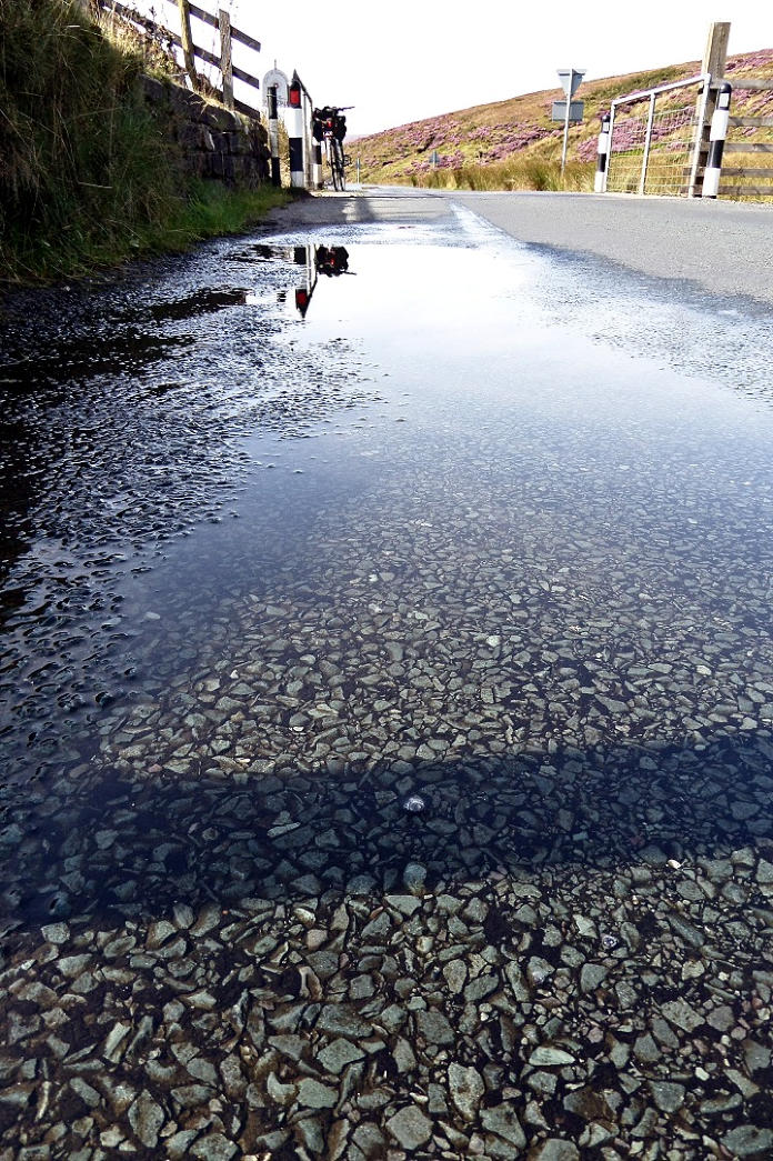Reflections on the road at the summit of the climb through the Trough of Bowland.
