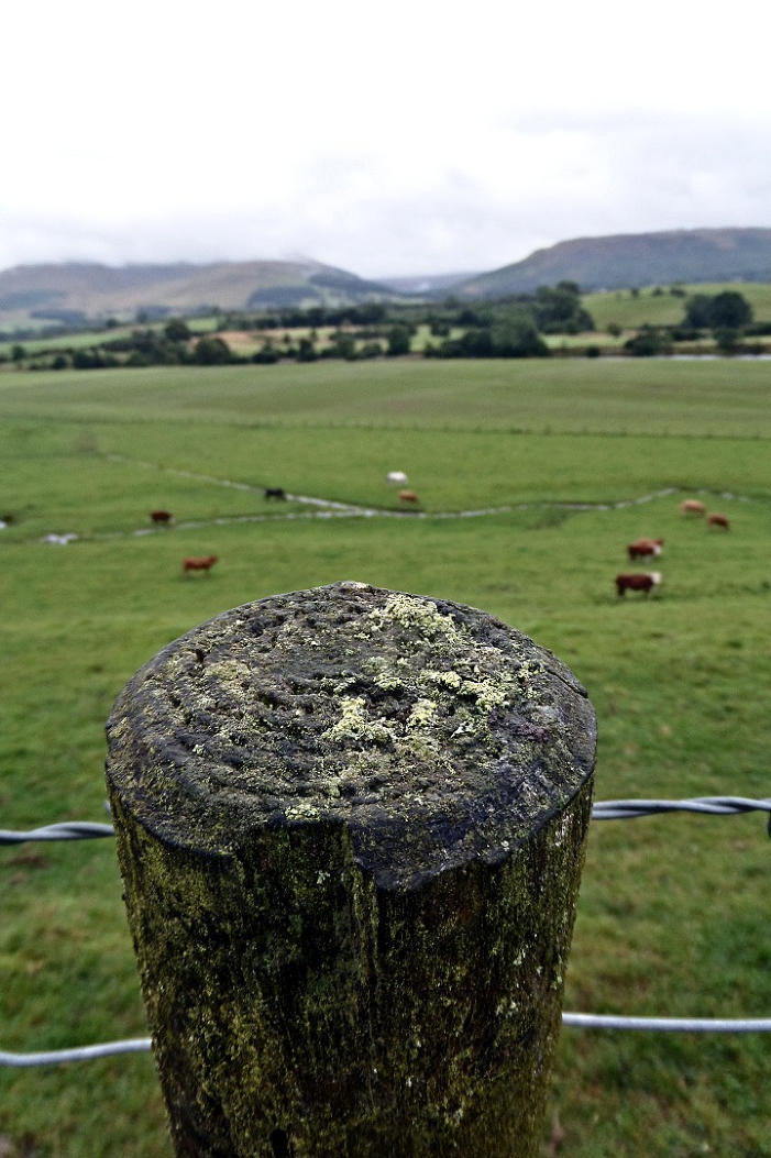 Fence post at side of the lane, with a wet view of the Lune Valley.