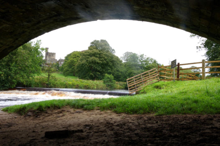 A view looking across the River Wenning towards Hornby Castle from under Hornby Bridge