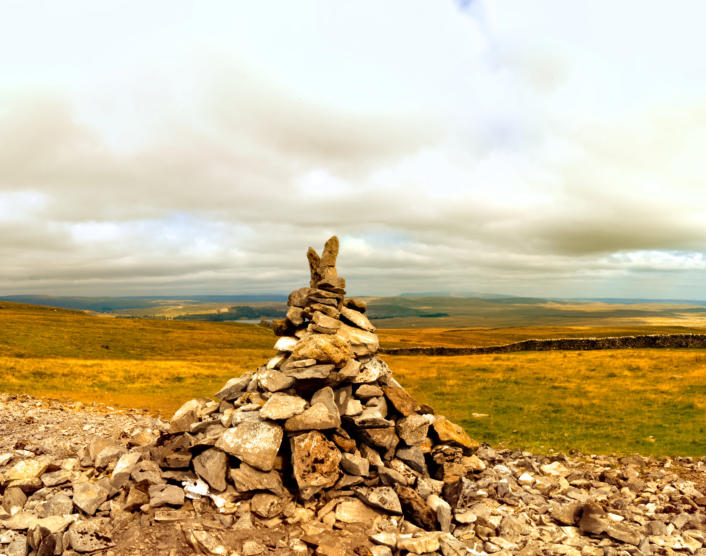 A view of the cairn at side of the bridleway with Malham Tarn in the background (Click the photo to see a