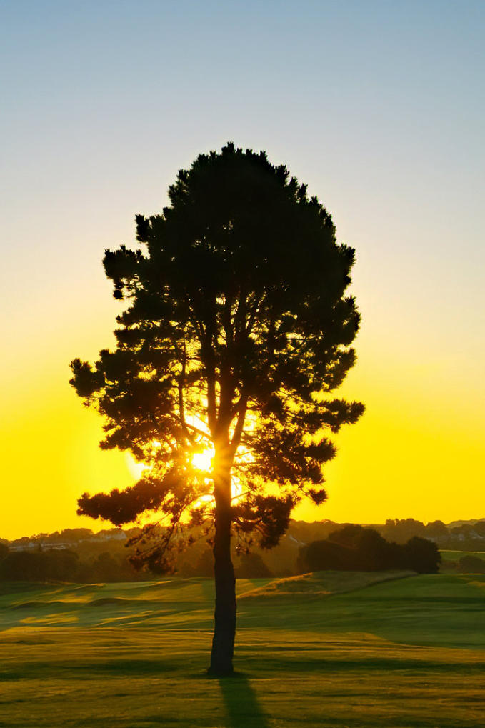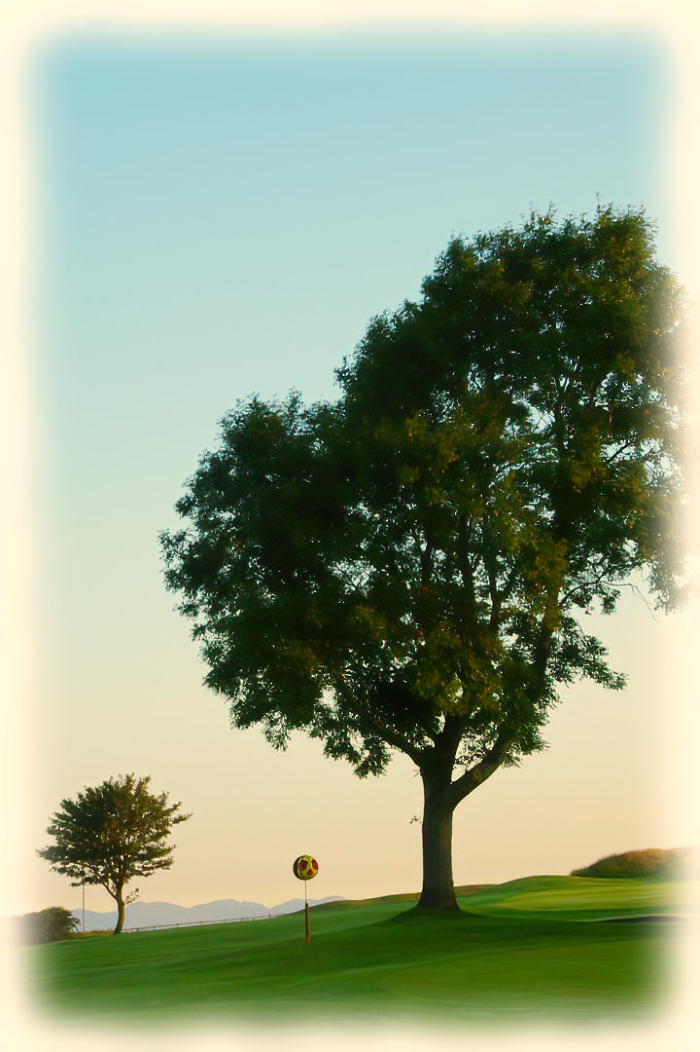 A view of the tree at back of 7th green with the Lakeland Mountains in the background.