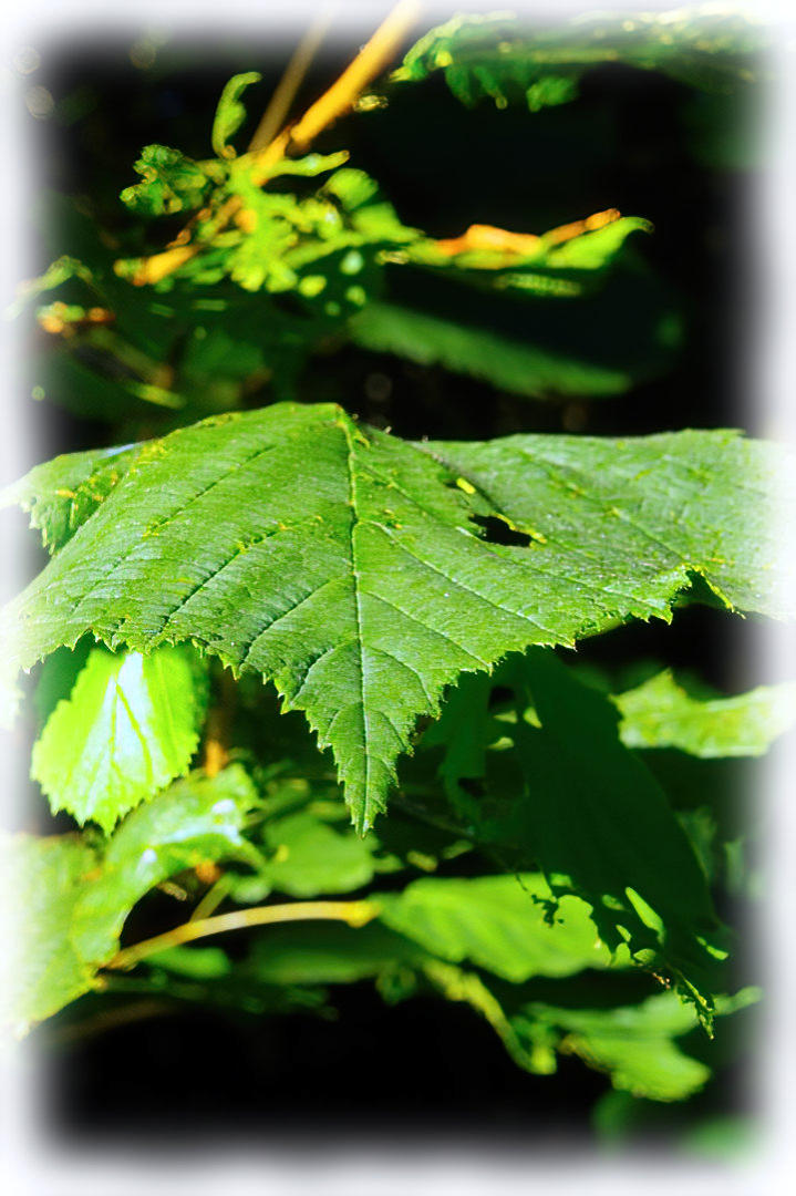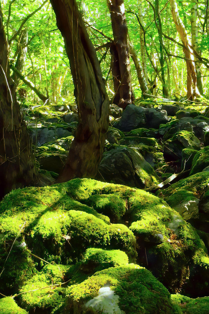 Sunlight shining on to moss cover limestone pavement in the reserve.