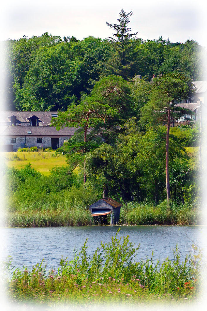 A view of the boat house on Hawes Water with Challan Hall in the back ground.