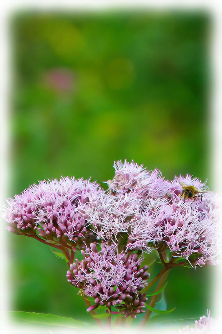 A bee feeding on Common Valerian at side of the footpath around Hawes Water