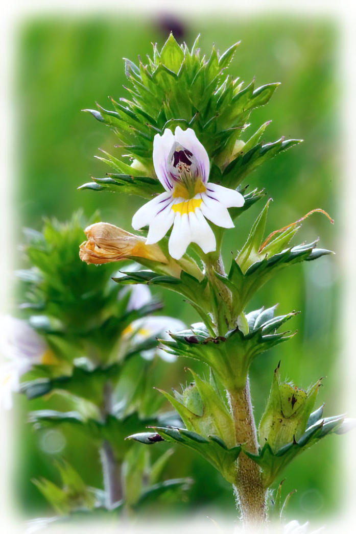 Common eyebright flowering in field at side of the footpath.