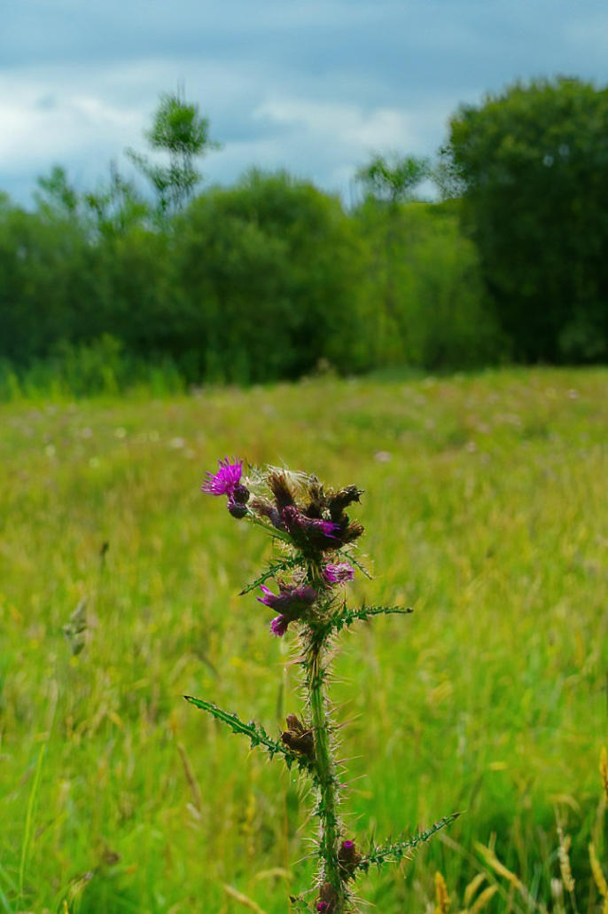 Creeping Thistle flowering in meadow.
