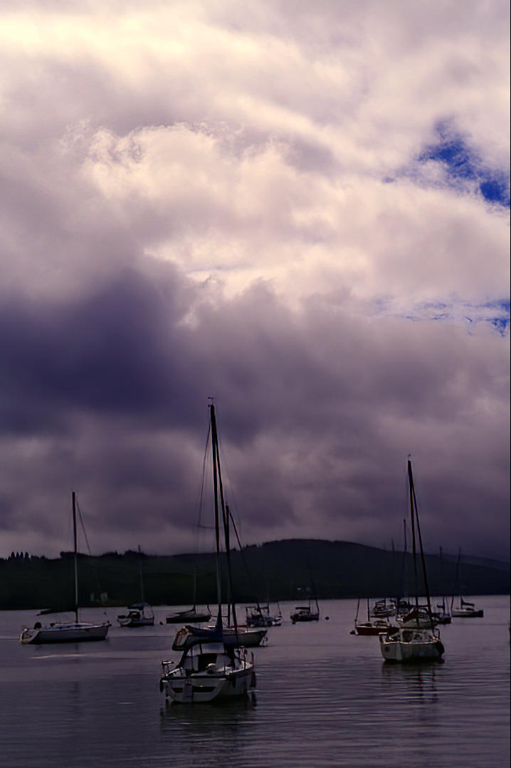 A view of yachts moor on Lake Windermere near Ash Landing Wood.