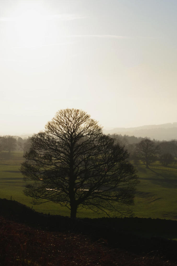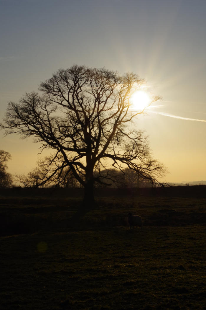 Late afternoon sunlight shinning on tree in field near Fell Garth.