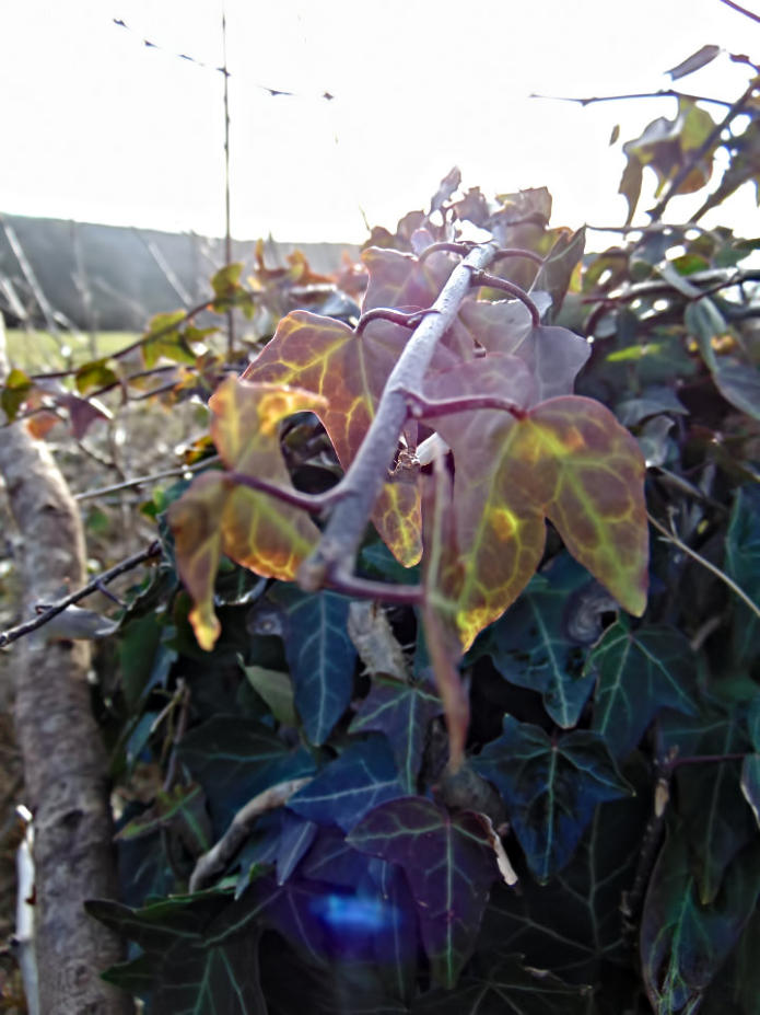 Afternoon sunlight on some Ivy at end of footpath at New Barns Bay.