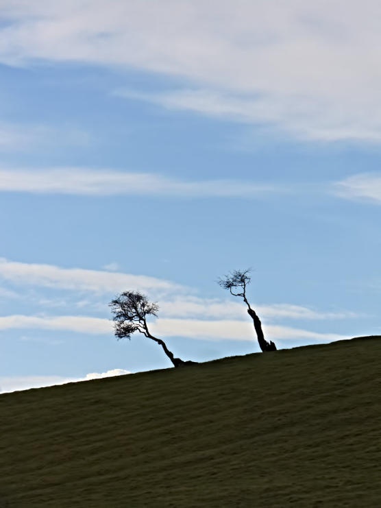 Two Hawthorns on the skyline at side of Kirkby Lonsdale Road near Halton