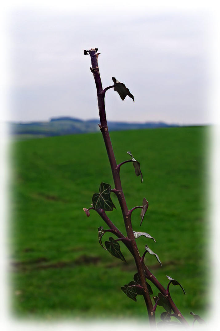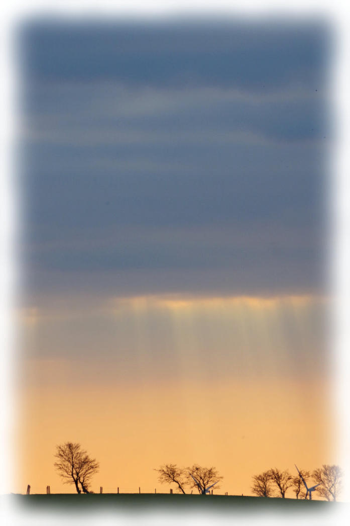 Late afternoon sunlight shining on hawthorn hedge on the skyline at side of Scargill Road.