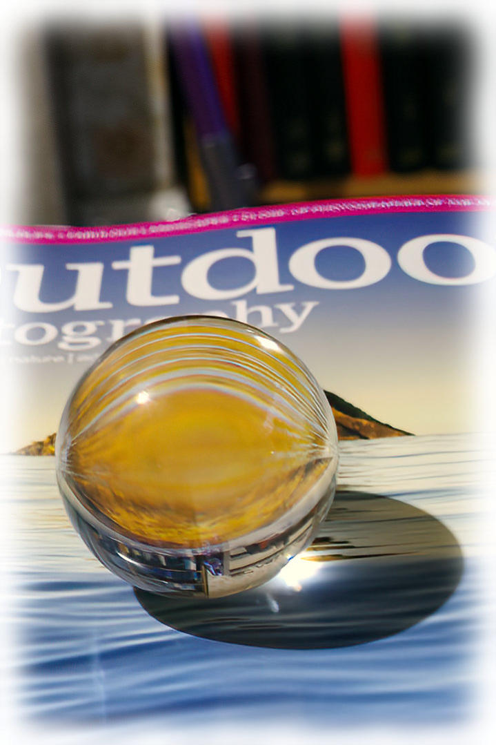 Lensball view of the current issue of Outdoor Photography in the living room.