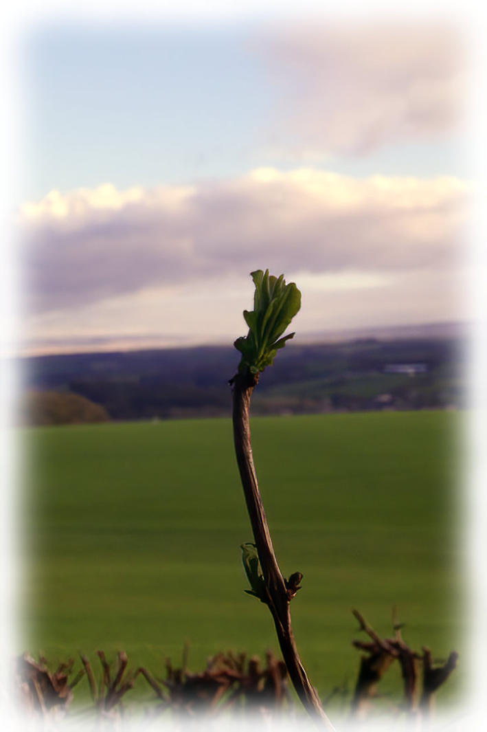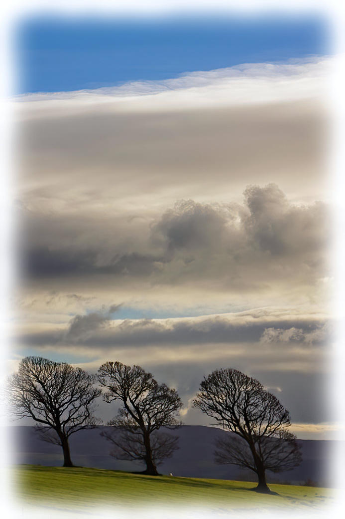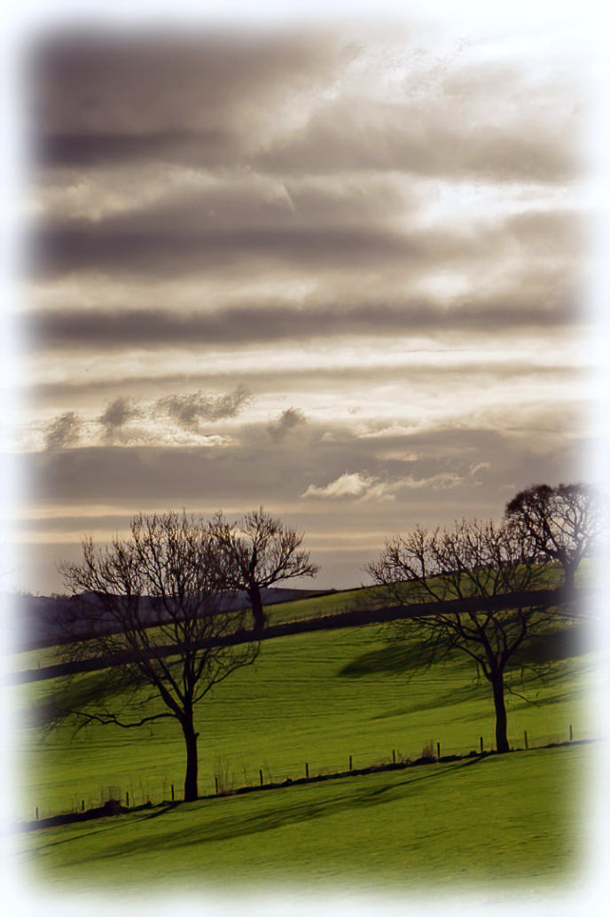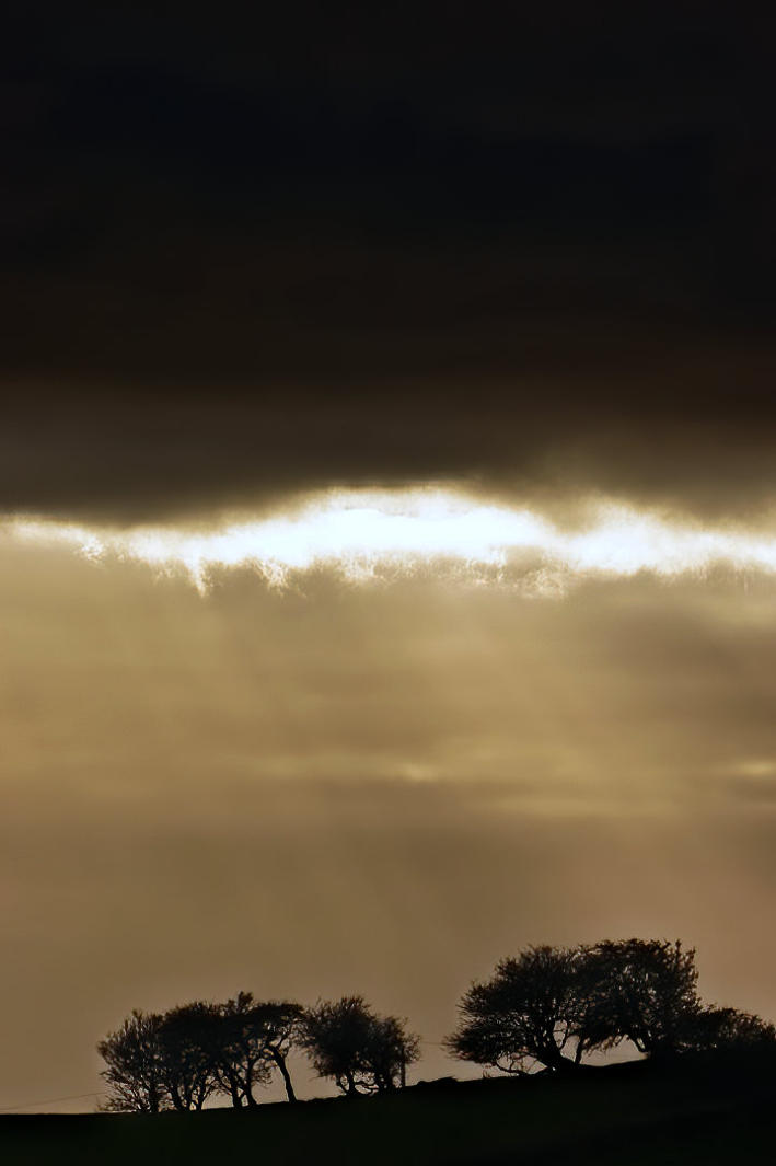 Late afternoon sunlight shining down on hedge in field at side of Kirkby Lonsdale Road.