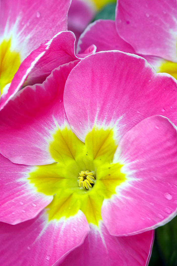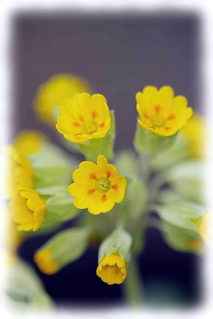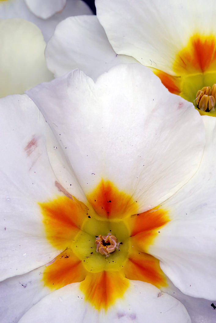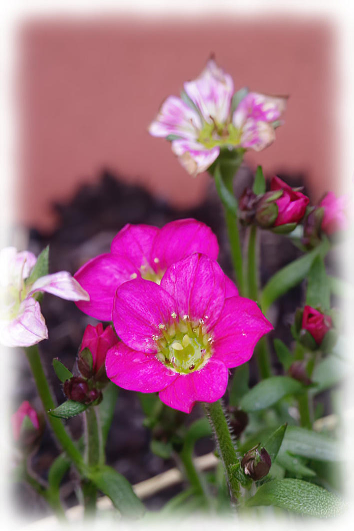 Primula vulgaris ‘Candy’ flowering in container in the garden.