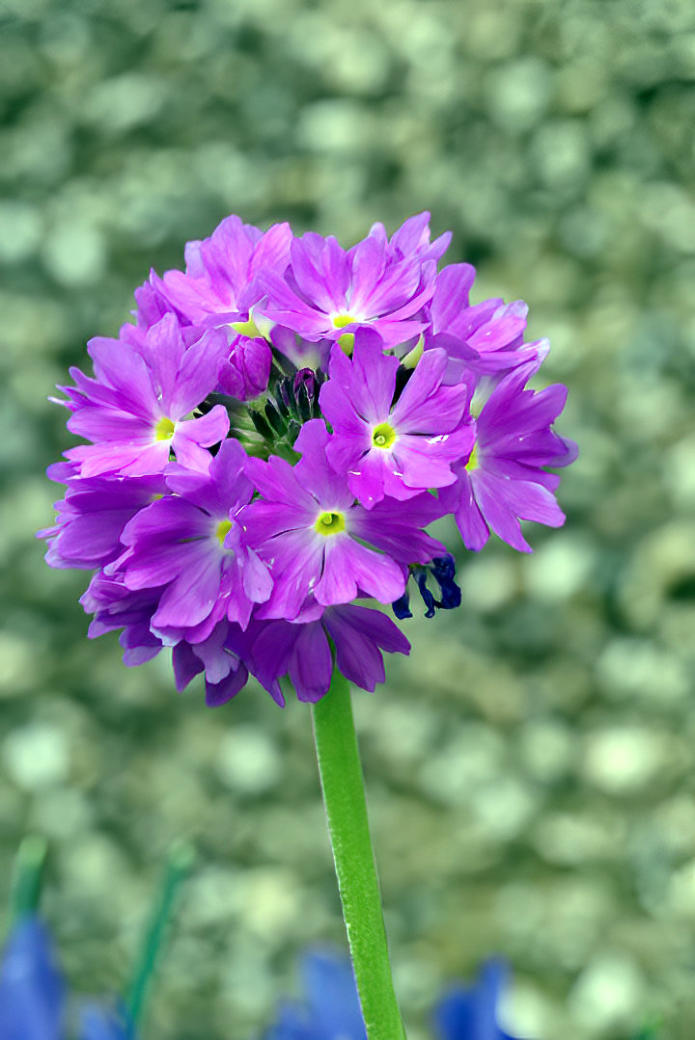 Primula denticulata ‘ Corolla Blue’ flowering in container in the garden.