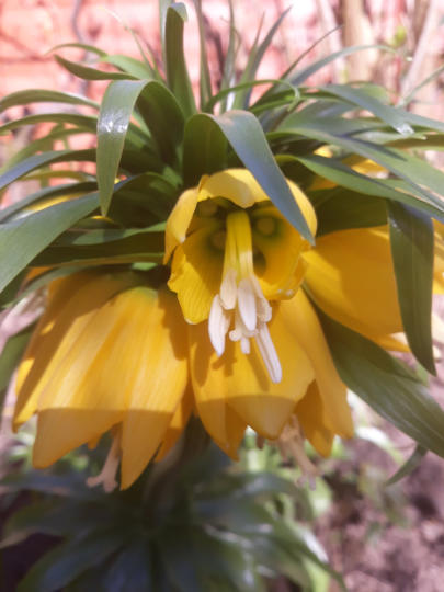 green stem, topped with clusters of rich yellow, bell-shaped, nodding flowers, and crowned by a cluster of