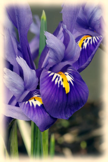 Iris reticulata ‘Harmony’ Information on the label: Eye catching royal blue flowers with bright yellow and white blotch, with sharply pointed pale grey green leaves.Last seen on the website in: Garden and Wild flower 2025 photo gallery,