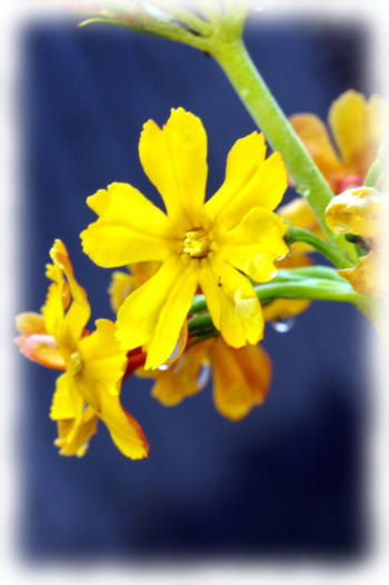 midrib. Stout stems with tiers of yellow through orange to purple flowers with a yellow eye in early Summer.