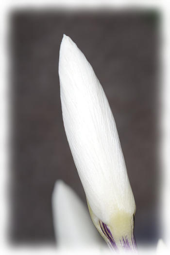 Crocus vernus ‘Jeanne d’Are’Information on the label: Attractive large snow white with faint purple veining, almost stemless with bright golden yellow anthers and spiky dark green and creamy white striped leaves.Last seen on the website in: 2nd March 2023 photo a day photo gallery.