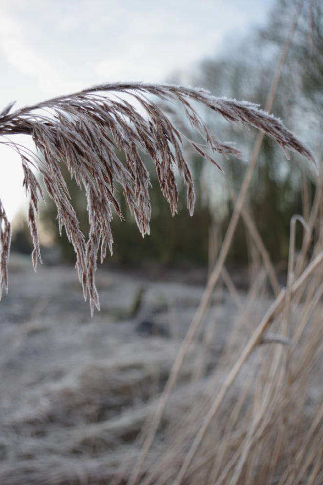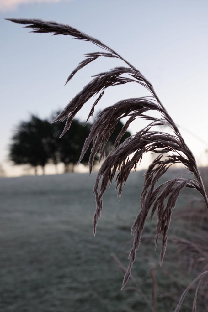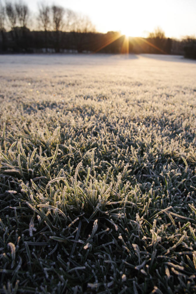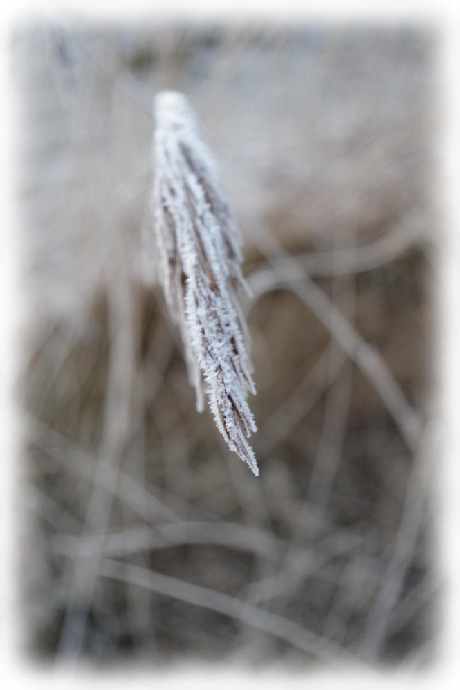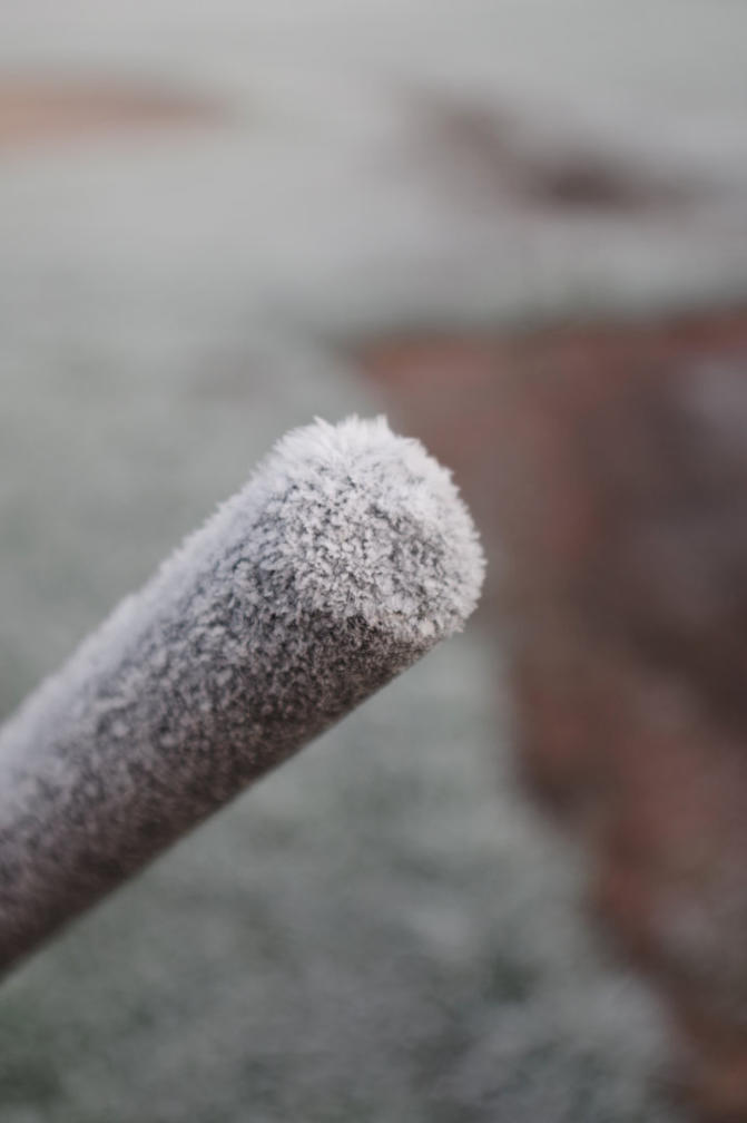 A close up of frost on rake handle at side of the 4th green.