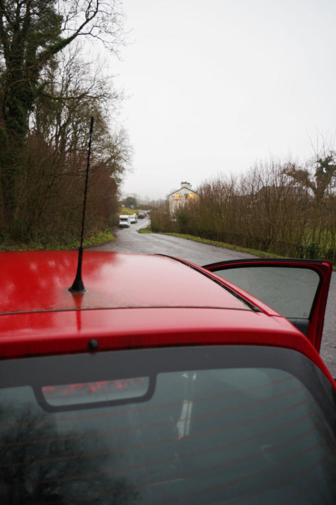 The view from the car looking toward the Derby Arms at Longhowe End near Witherslack.
