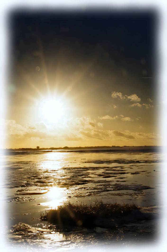 Late afternoon sunlight shining down on the shore near Morecambe Lodge.