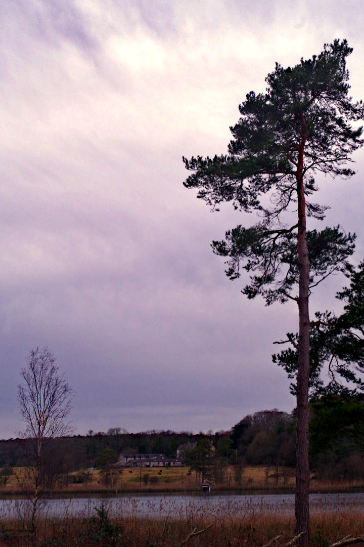 The view looking across Hawes Water towards the boat house and Challan Hall.