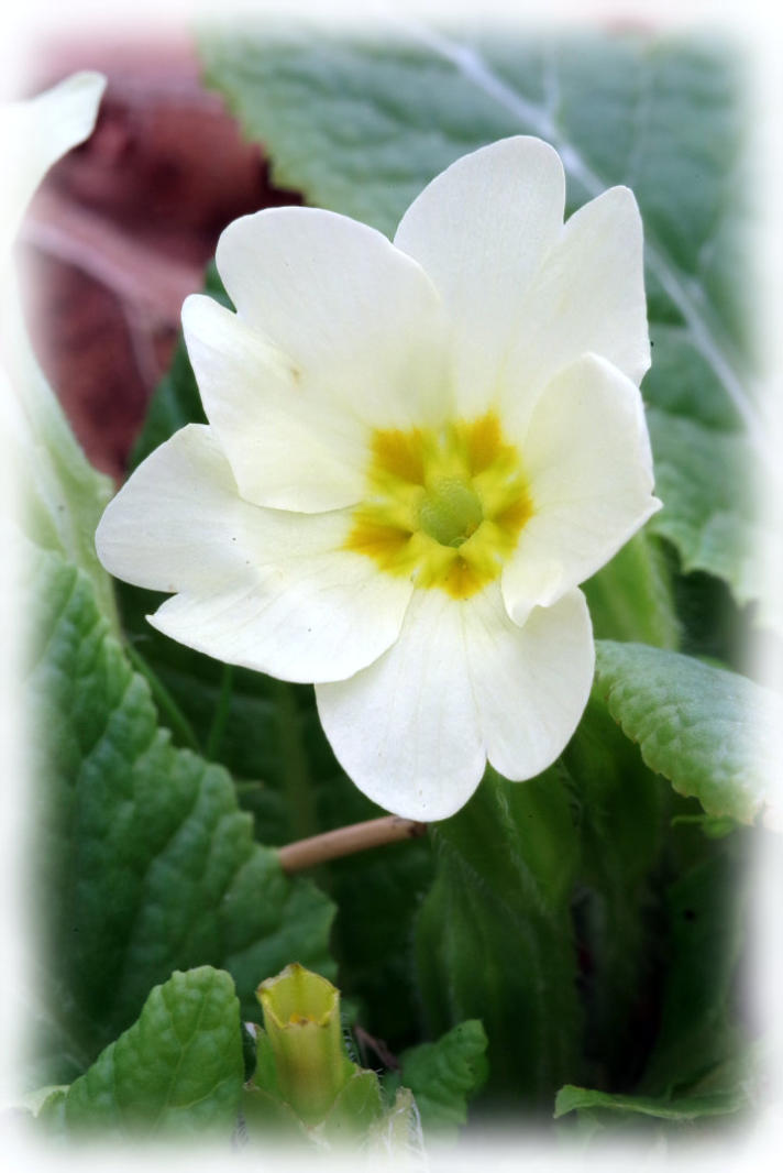 A Primrose flowering on the village green in Borwick.