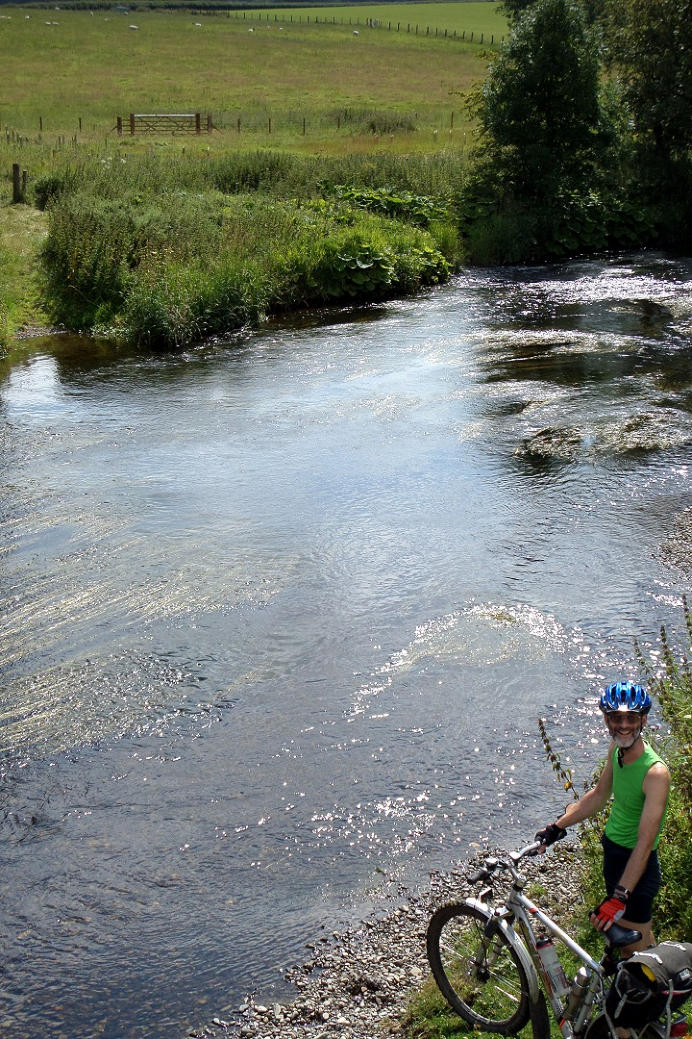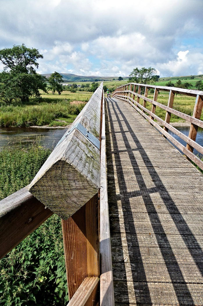 Looking back at Nick using the bridge to cross the River Lowther.