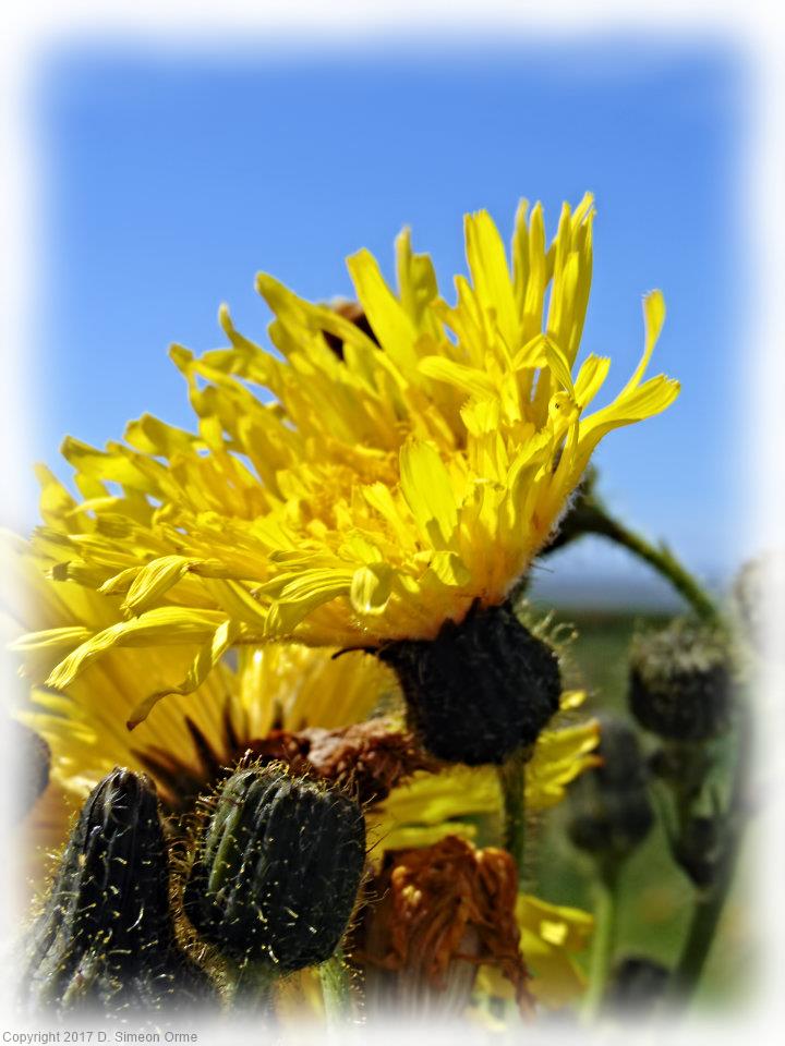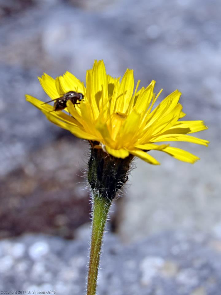 Hawkweed in flower on a wall at side of lane on the climb up to Silverdale Green.