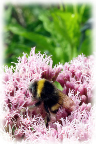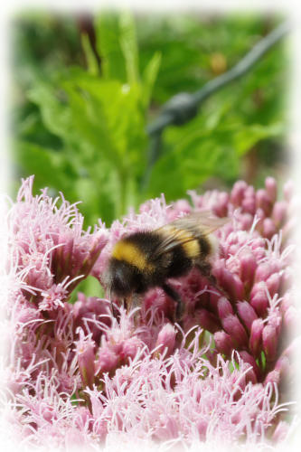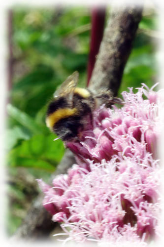 A bee on Common or Marsh Valerian at side of footpath around Hawes Water.