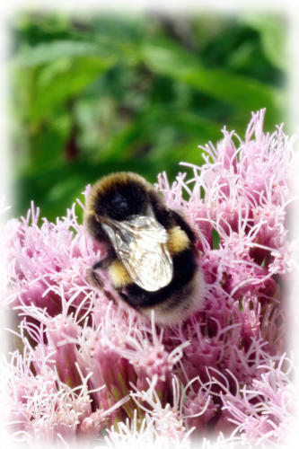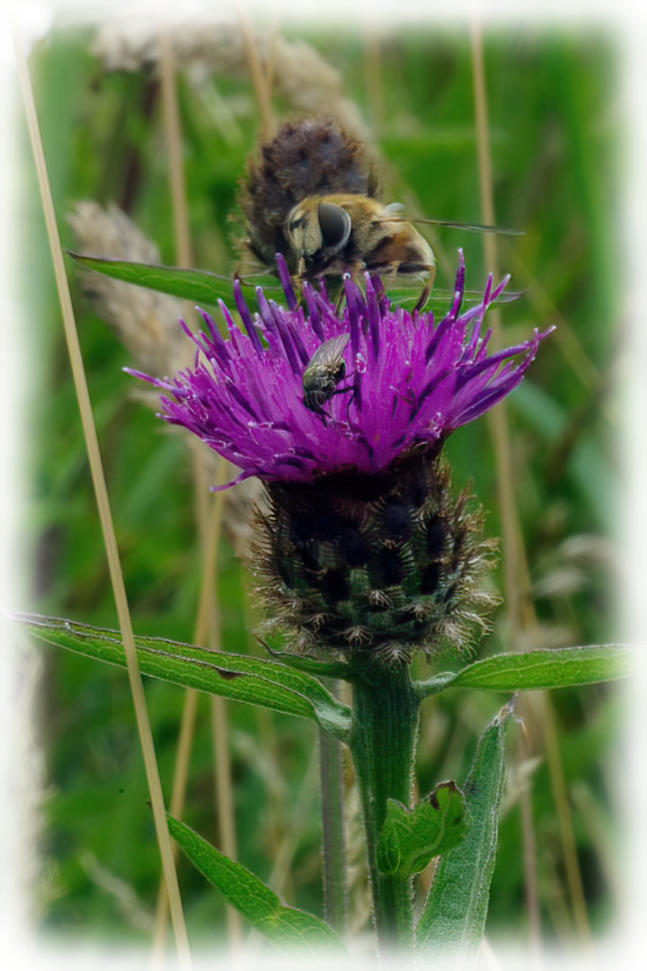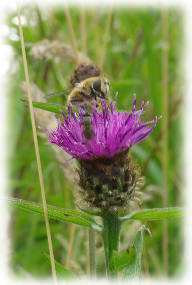 A bee and fly on Common Knapweed at side of towpath of the Lancaster Canal at the locks at