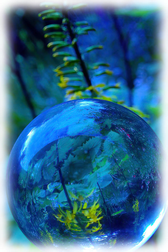 A lensball view of Ligularia ‘Little Rocket’ flowering in the back garden.