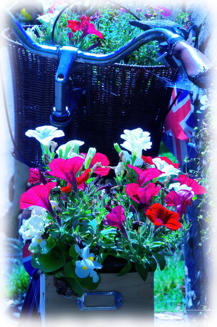 Summer bedding plants flowering on a bike in Clapham.