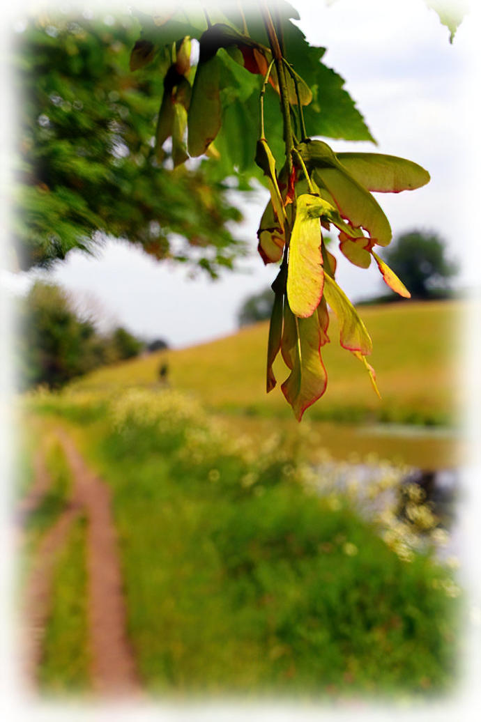 A close up of Sycamore fruit hanging over the towpath of the Lancaster Canal.