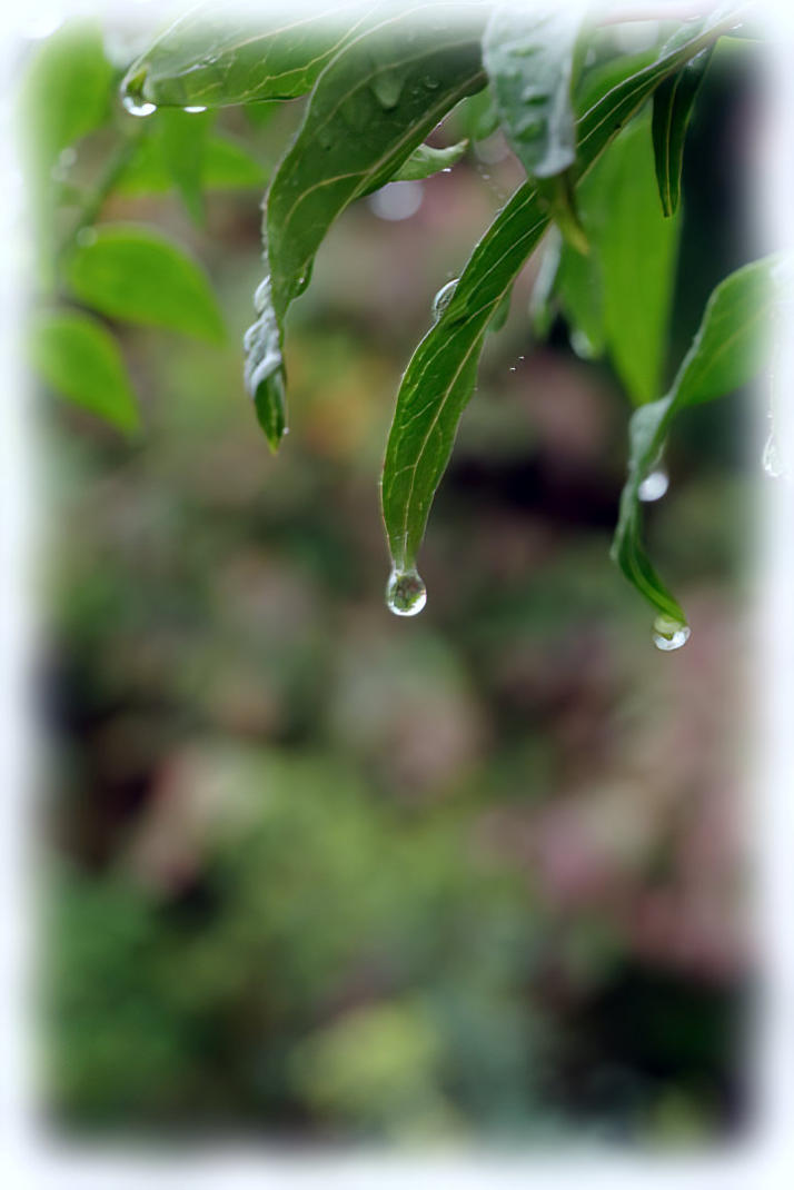 Rain drops on leaves of Jasminum humile in the back garden.
