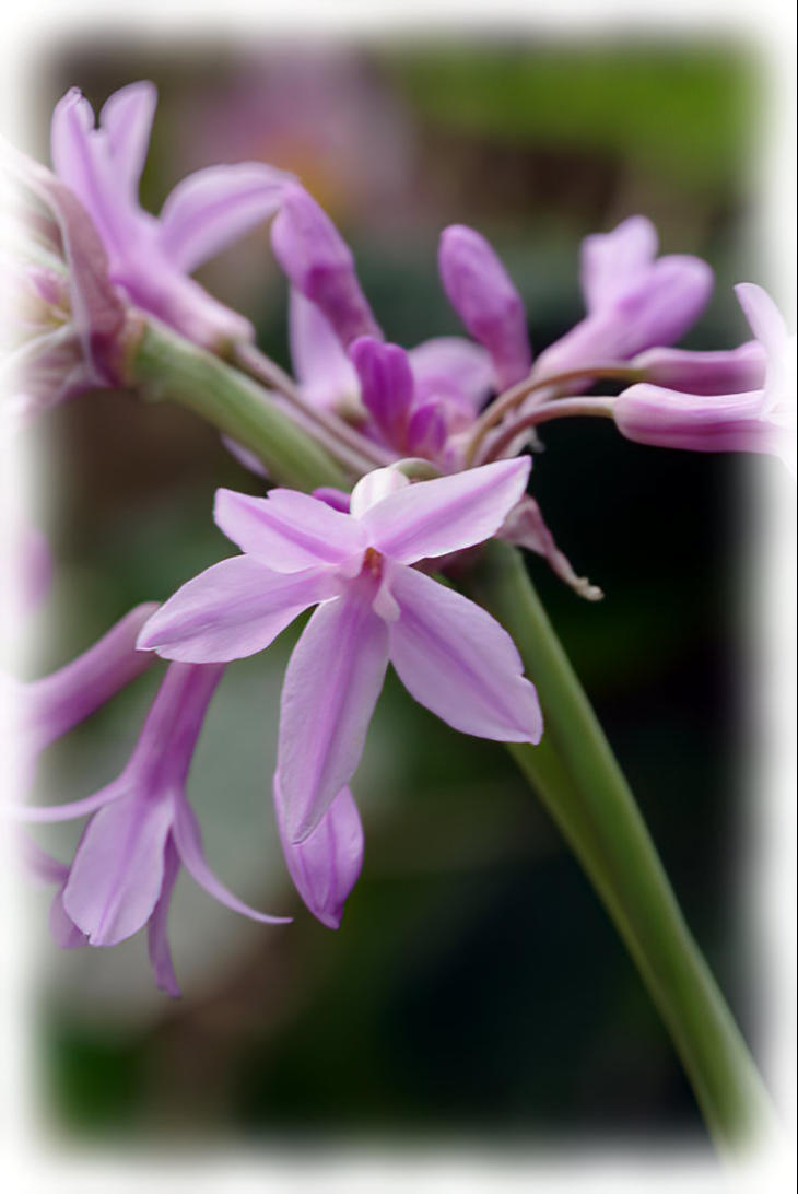 Tulbaghia violacea ‘Silver Lace’ flowering in container in the garden.